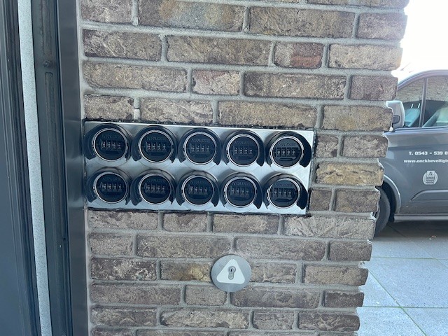 Code beslag rvs, i.c.m. zelf vergrendelende meerpunt-sluiting. Nieuwe toegangsdeur bijkeuken met veiligheids beglazing. Altijd naar binnen kunnen met een persoonlijke code of vingerscan, dus geen sleutels meer nodig. Kinderen die u nog geen sleutel toe vertrouwd kunnen zonder gebruik van sleutels naar binnen.
